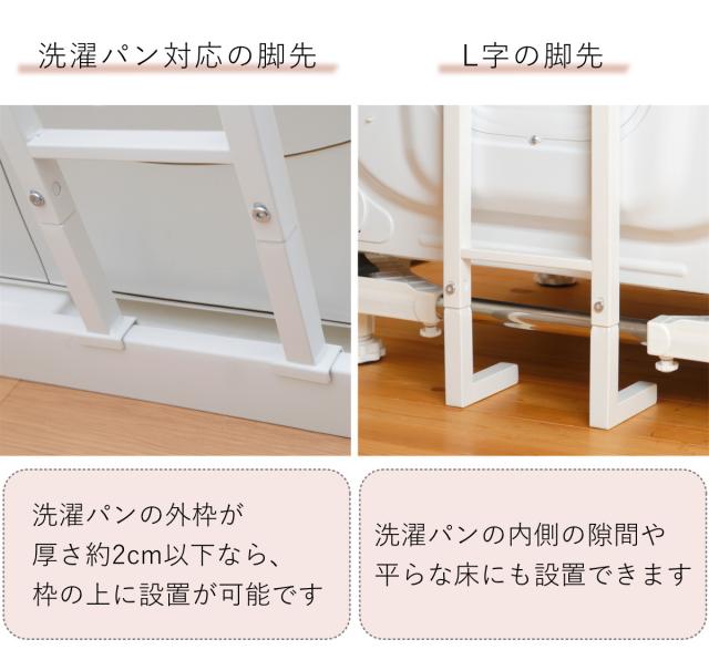 脚先は2種類付属しています。設置する際にランドリースペースの環境によって脚先を選ぶことができます。防水パン対応の脚先は、外枠の厚さ約2cm以下の洗濯パンなら、枠の上に設置できます。L字の脚先は、洗濯パンの底面の隙間や、平らな床に設置できます。