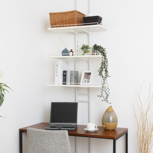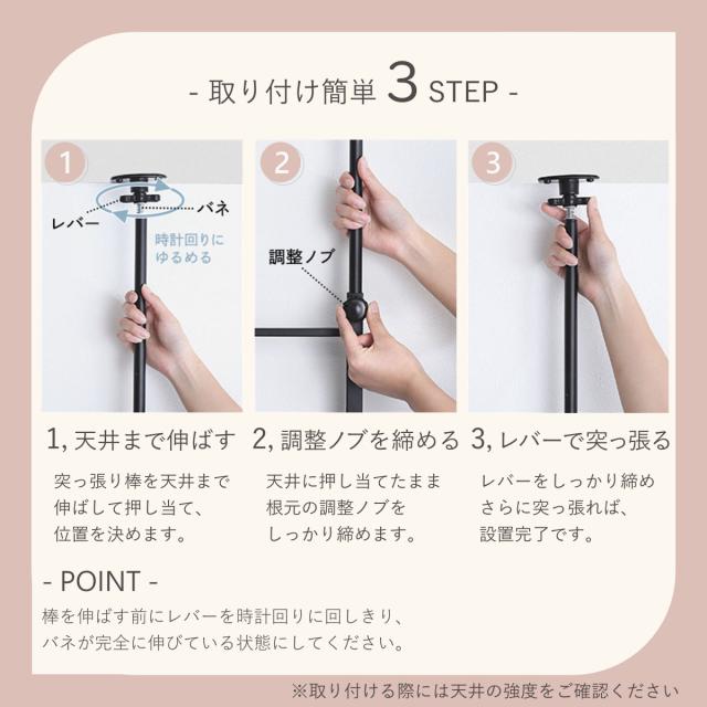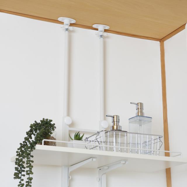 工事不要で設置できる安定感のある突っ張り式。床と天井にきちんと固定することで転倒防止対策もばっちりです。天井が傷付くことにも配慮したクッション付きで、壁に穴を開けることなく手軽に収納を増やすことができます。