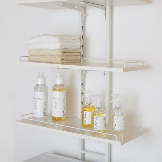 3枚の棚板は5cmピッチ15段階で調節できるので、置きたい物やお使いの洗濯機の高さに合わせることができます。お好みの高さに棚受けを設置して棚板をネジで固定するので、棚ごと落ちてしまう心配もなく安心です。