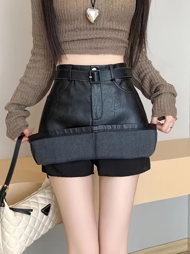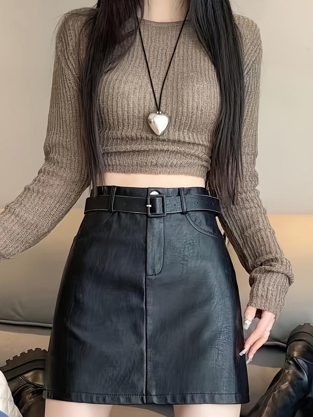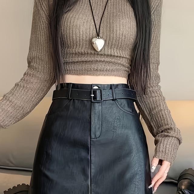 エレガントPUレザーミニスカート、ベルト付き、高品質、春秋