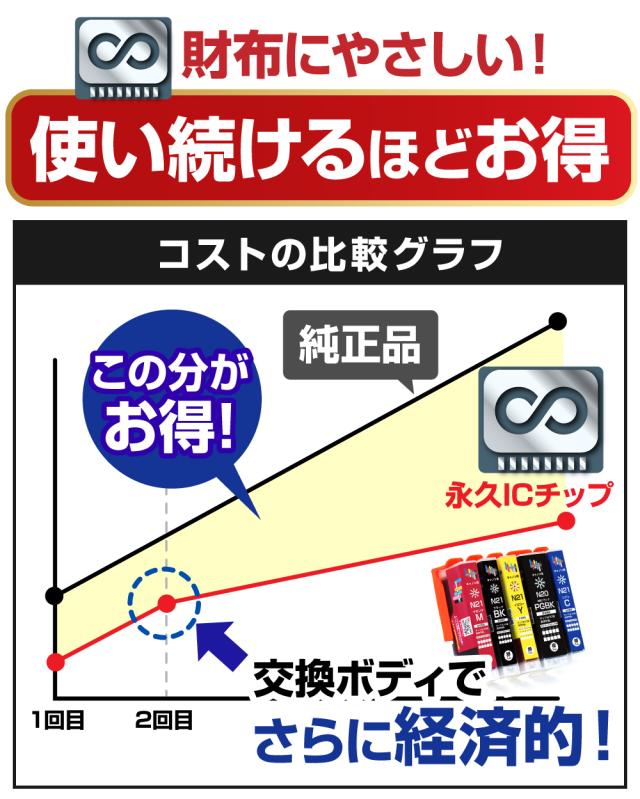 | 繰り返し使える永久ICチップ付きの互換インクカートリッジです。インクが無くなった際は、インクボディのみ(ICチップなし)を追加でご購入いただき、永久ICチップを付け替えることで、ご使用いただけます。 永久ICチップを繰り返し使用することでコストを削減し、環境にも経済的にも優しい商品です。ぜひお試しください。 |