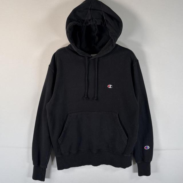 古着 チャンピオン Champion パーカー プルオーバー ワンポイントロゴ刺繍 フーディ マフポケット フード紐 SMALL ブラック レディース