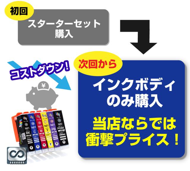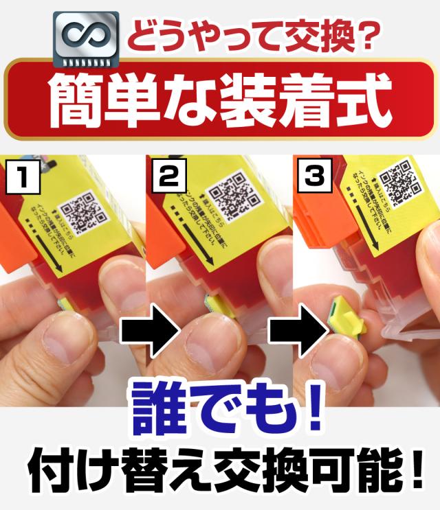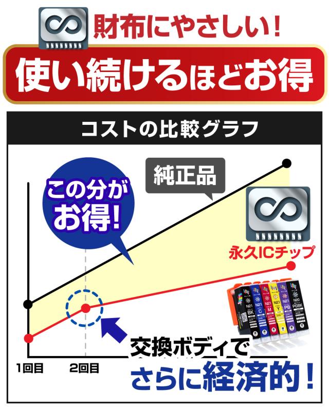 | 繰り返し使える永久ICチップ付きの互換インクカートリッジです。インクが無くなった際は、インクボディのみ(ICチップなし)を追加でご購入いただき、永久ICチップを付け替えることで、ご使用いただけます。 永久ICチップを繰り返し使用することでコストを削減し、環境にも経済的にも優しい商品です。ぜひお試しください。 |