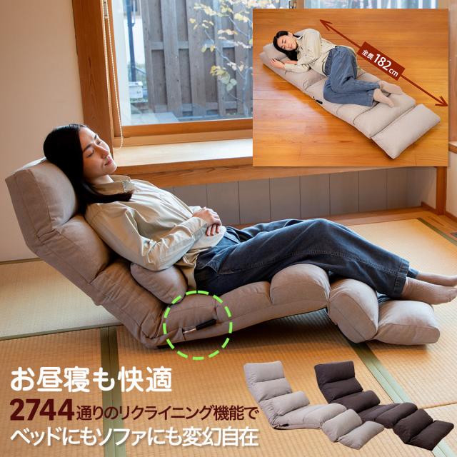 小さな座椅子だと物足りない、なんてゆう方におすすめです。フルフラット時の全長なんと182cm。業界屈指の超ロングタイプ。文字通り頭から足まで全身座れちゃいます。フルフラットに伸ばせばお昼寝に最適なベッドにも。