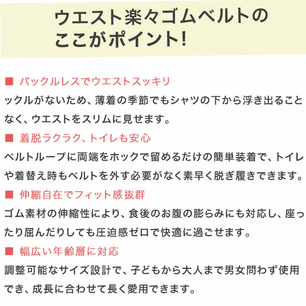 ウエストの悩みを解決する、つけていないような快適さでありながら見た目もスッキリ決まる、それがウエスト楽々ゴムベルトですね!