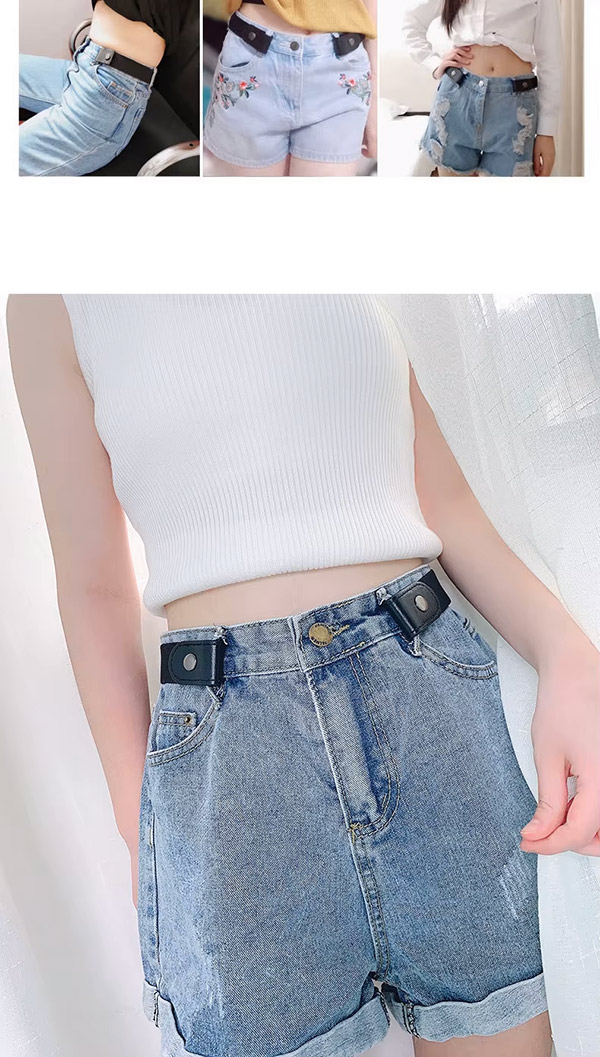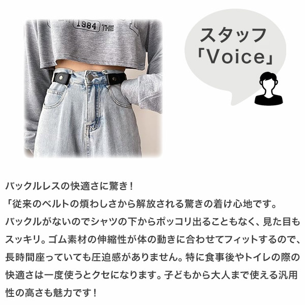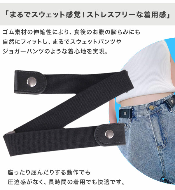 バックルがないため、薄着の季節でもシャツの下から浮き出ることなく、ウエストをスリムに見せます。
