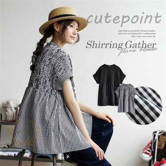 ブラウス レディース 夏 トップス 半袖 チュニック ズーティー シャーリングギャザー フレアブラウス カジュアル ゆったり 通勤 オフィス 通学 おしゃれ 可愛い
