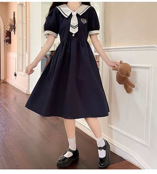 ワンピース ビッグカラー セーラー風 胸元リボン 半袖 夏用 夏服 かわいい レディース 中学生 デコ襟 大きいサ