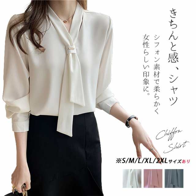 シャツ ブラウス 七分袖 シフォン リボン付き レディース フォーマルシャツ 長袖 トップス 夏 スタンドカラー 上着 肌着 インナー 着痩せ 透け感 大きいサイズ カジュアル おしゃれ オフィス 仕事 ゆったり シンプル おすすめ 無地 OL S-2XL ピンク ホワイト ブルー 送料無料