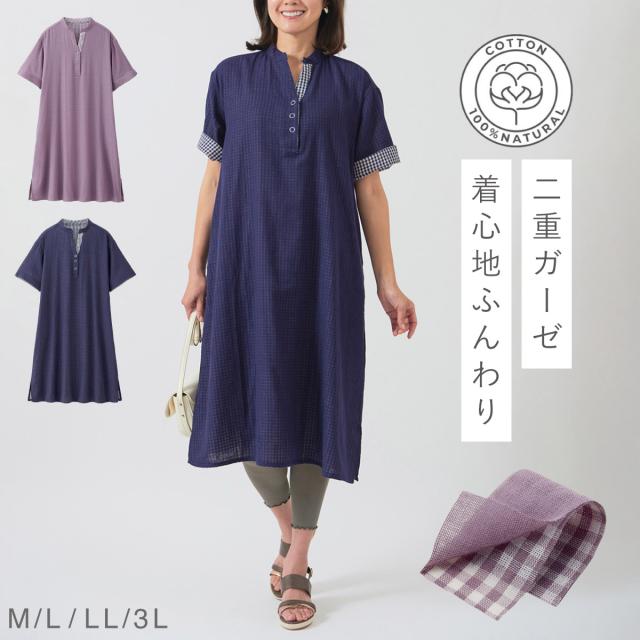 ダブルガーゼ 生地 二重 綿100% チュニックワンピース M L LL 大きいサイズ 3L ゆったり ポケット付き 柔らかい やわらかい 40代 50代 60代 70代 大人可愛い 春夏 Wガーゼ コットン レディース チェック 軽やかダブルガーゼ 部屋着 おしりカバー 体型カバー プルオーバー