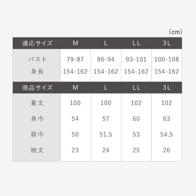 ■サイズ:M/バスト79-87、着丈100、身幅54、肩幅50、袖丈23、L/バスト86-94、着丈100、身幅57、肩幅51.5、袖丈24、LL/バスト93-101、着丈102、身幅60、肩幅53、袖丈25、3L/バスト100-108、着丈102、身幅63、肩幅54.5、袖丈26cm