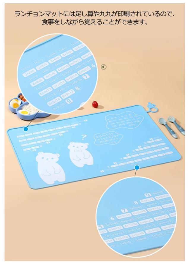 | シリコン断熱滑り止めランチョンマット 【食品グレードのシリコン】安全で耐久性があります。 【高温耐性ランチョンマット】厚みがあり、断熱性に優れ、熱を効果的に遮断し、テーブルトップを保護します。 【柔軟で弾力性が高い】引っ張りに強く折れにくい。 ランチョンマット表面は特別に加工されており、安定して滑りません。 スープのあふれを防ぐために境界線を高くする 軽量で折りたたみ可能で、保管が簡単でスペースを取りません 収納袋付きで収納に便利 ランチョンマットには足し算や九九が印刷されているので、食事をしながら覚えることができます。 | |