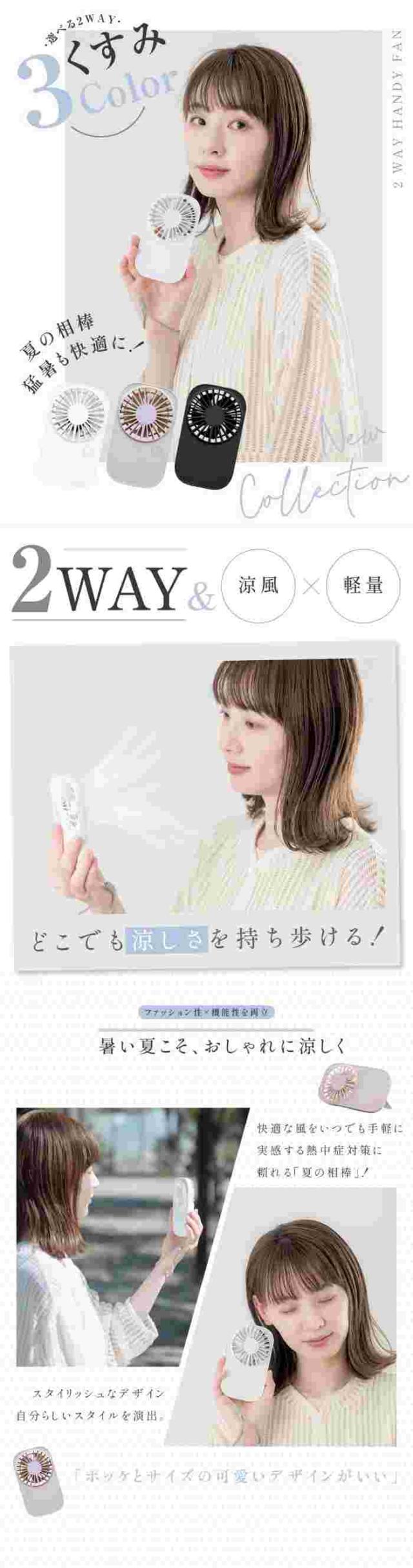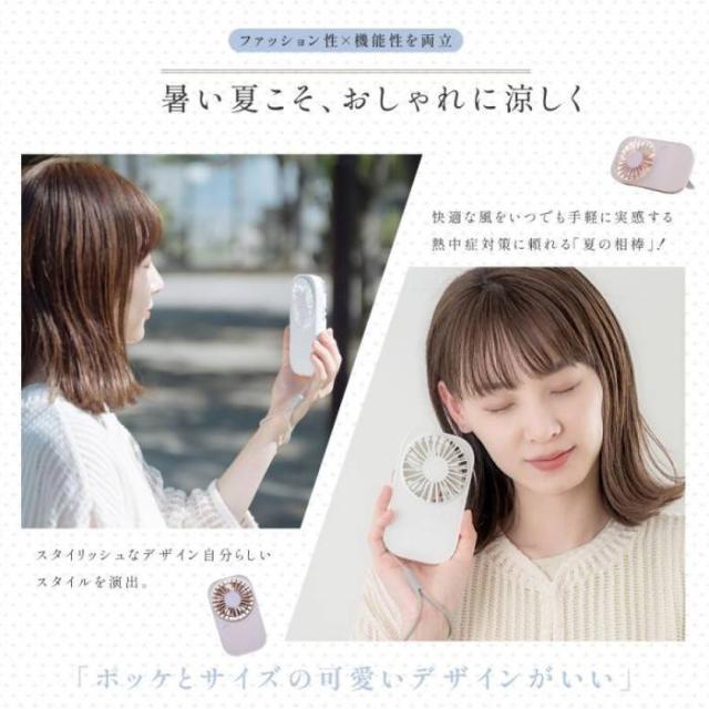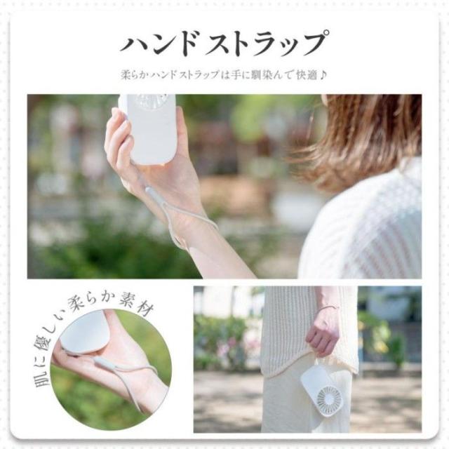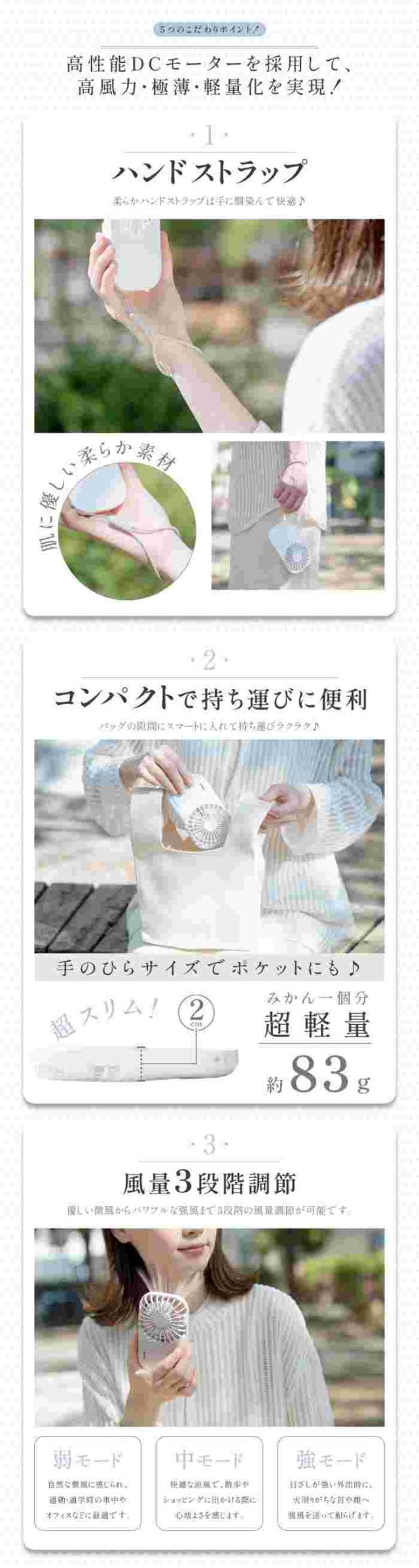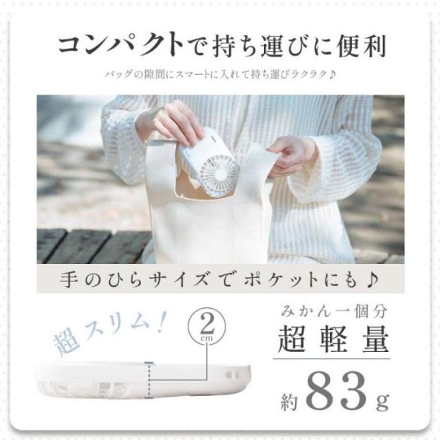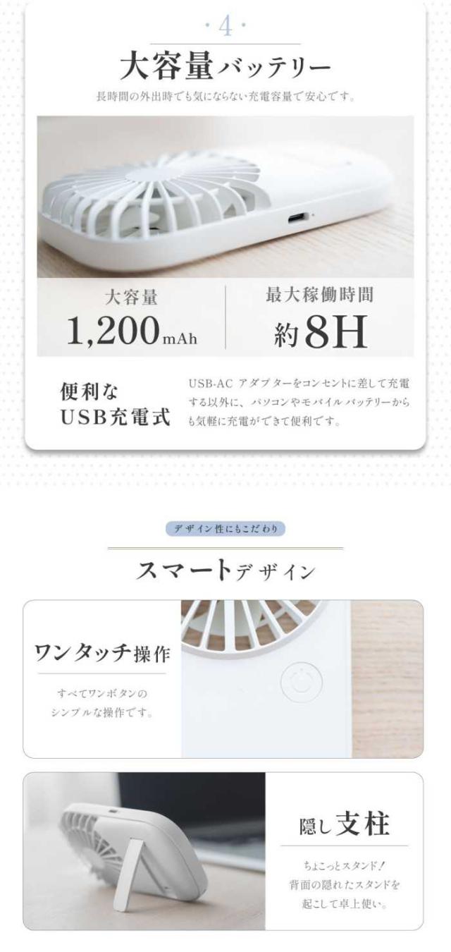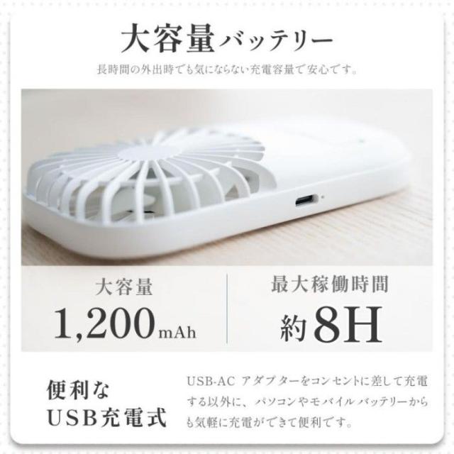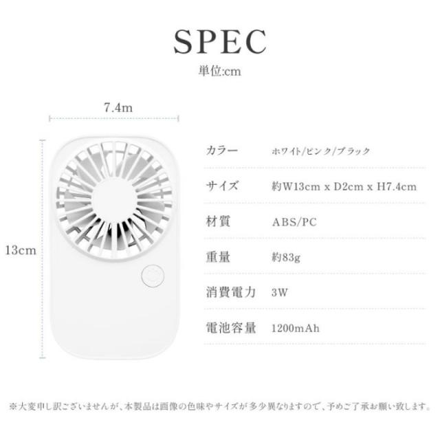 【仕様】 本体サイズ:約W7.4xD2xH13cm / 本体材質:ABS+PP/ 重量:約83g/充電容量:1200mAh / 電圧:DC5V/1A / 消費電力:3W / 風量:3段階