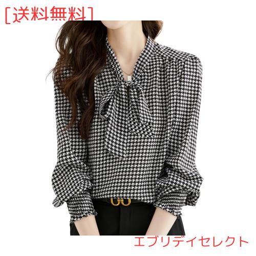 [Bidason] 千鳥柄 ブラウス レディース シャツ 長袖 リボン付き おしゃれ エレガント 可愛い 上品 パフスリーブ 女性らしい ゆる感 着痩