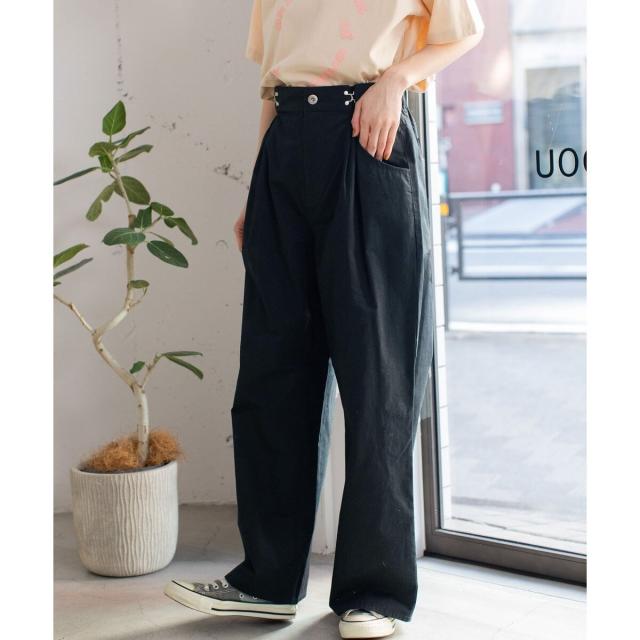 ウエストホックでタックを取ったデザインパンツ。程よくルーズなシルエットとすっきりとしたウエストラインでトップスインのスタイルも可愛いです。カジュアルでボーイッシュな雰囲気のボトムスで季節を問わずロングシーズン着回せます。