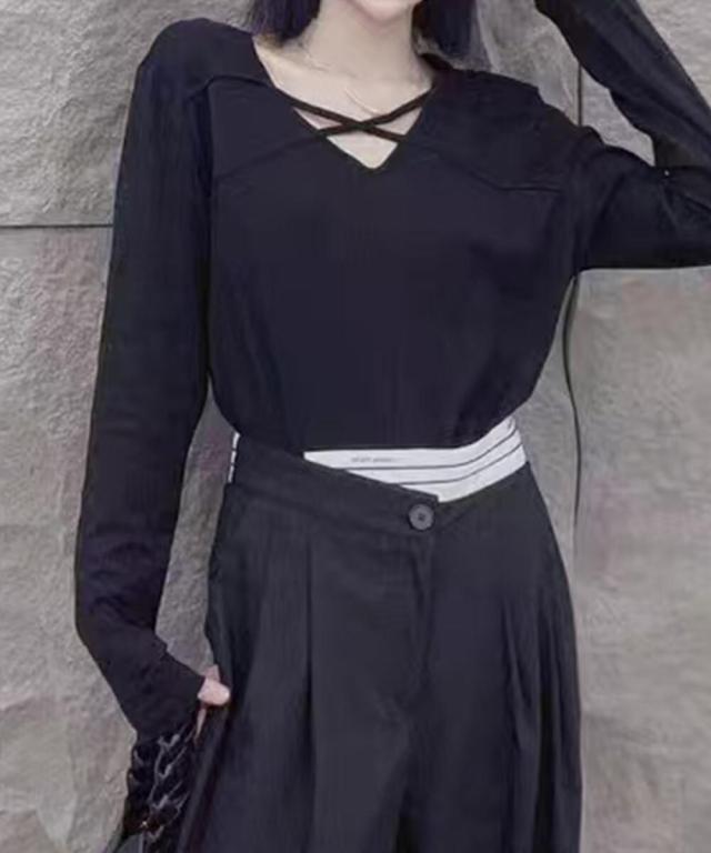 クロスデザインが特徴のVネック長袖トップスです。クロスされた華奢ストラップがコーデをアップデート!ボディラインに優しくフィットしコンパクトなスリムシルエットが華奢見え。