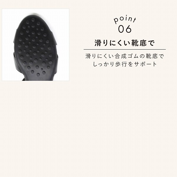 ・滑りにくい合成ゴムのドットソールで衝撃を吸収して歩行をサポート