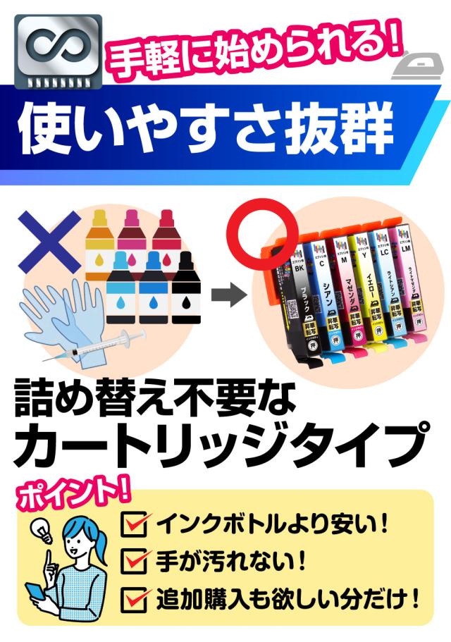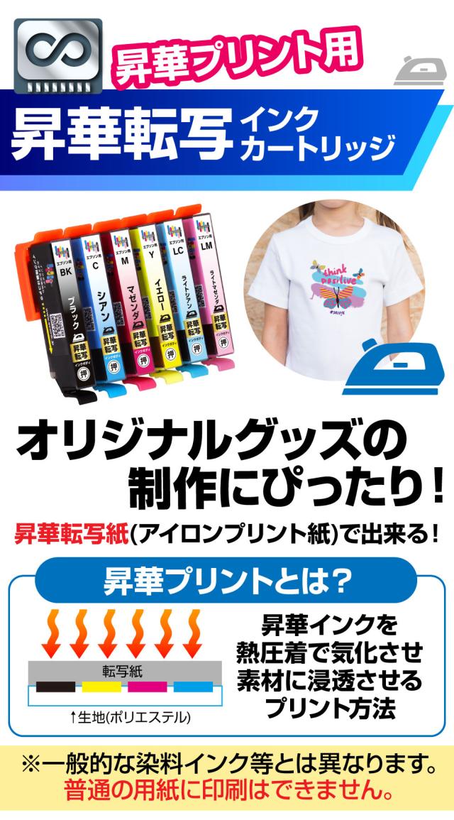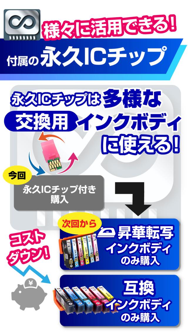商品の特性:繰り返し使える永久ICチップを装着して使用する昇華転写専用インクカートリッジです。昇華転写は、転写紙にデザインを出力し、熱プレスで気化させ素材に転写するプリント方法です。衣類や小物などオリジナルグッズを制作するのにオススメです。 インクが無くなった際は、昇華転写専用のインクボディのみ(ICチップなし)を追加でご購入いただき、永久ICチップ付け替えることで、ご使用いただけます。 永久ICチップを繰り返し使用することでコストを削減し、環境にも経済的にも優しい商品です。