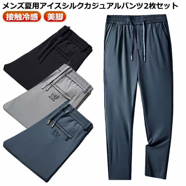 2枚セット! アイスシルクパンツ メンズ 冷感パンツ アイスシルク 接触冷感 パンツ ひんやり 涼しい ロングパンツ カジュアル 夏 薄手 ゴルフパンツ ストレッチ 伸縮 長ズボン 通気 速乾 スポーツ イージーパンツ 無地 おしゃれ 大きいサイズ 夏 春 秋 送料無料