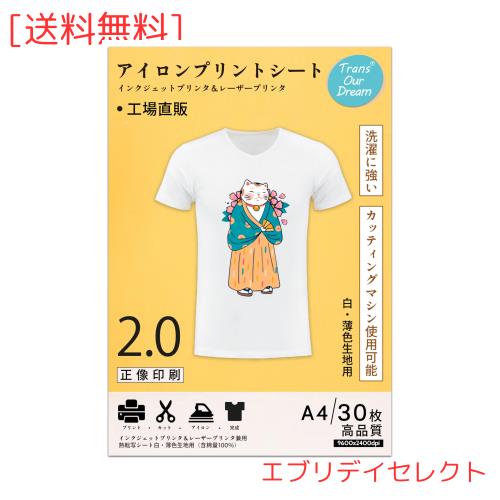 ◆商品名:TransOurDream 真正の転写シート アイロンプリントシート 白・薄色生地用 A4 30枚 転写紙 アイロンプリントべーパー アイロンプリント用