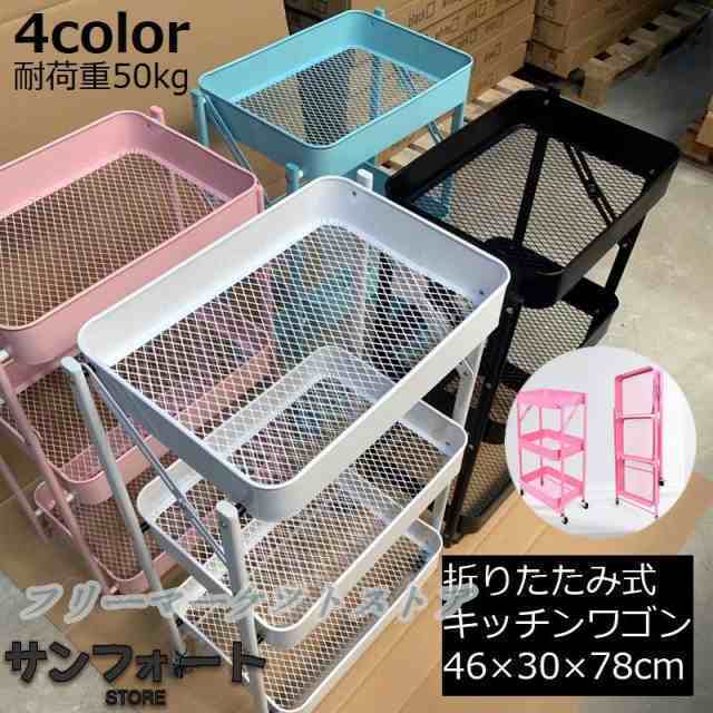 キッチンワゴン 折りたたみ キャスター付き 3段 耐荷重50kg バスケットワゴン メタルラック 収納 大容量 スリム 移動式