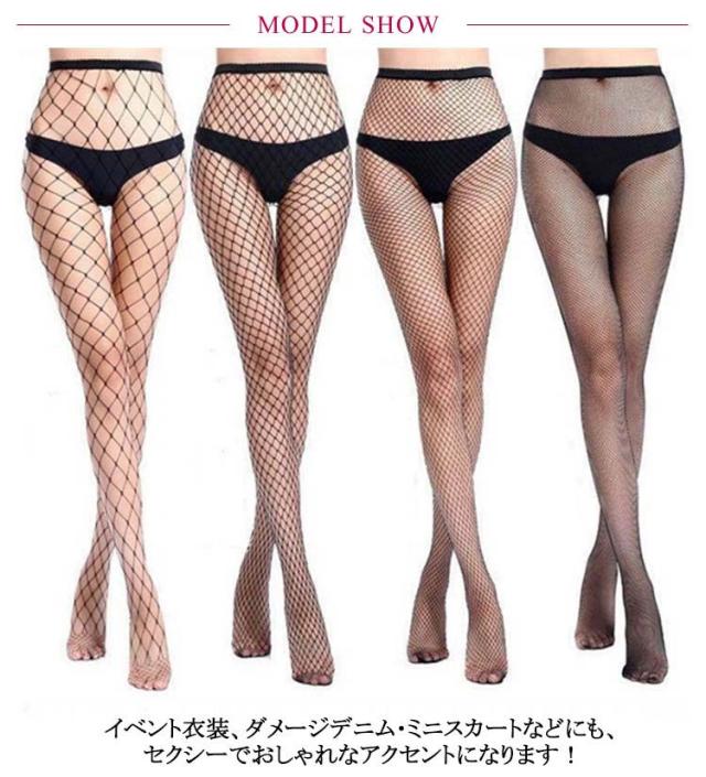 | 網の大きさが4タイプ。シンプルなタイプで通年通して履きやすい、タイツ。 イベント衣装、ダメージデニム・ミニスカートなどにも、セクシーでおしゃれなアクセントになります! | |