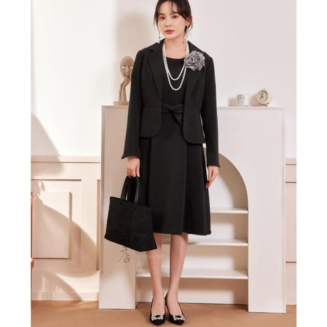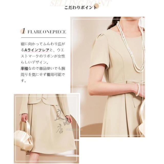 ウエストリボンがフェミニンなAラインの半袖フレアワンピースと、テーラードジャケットのフォーマル2点セットアップ。