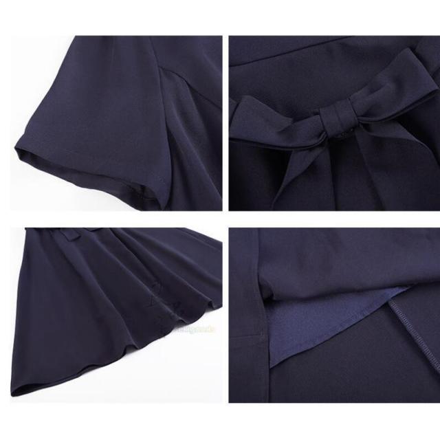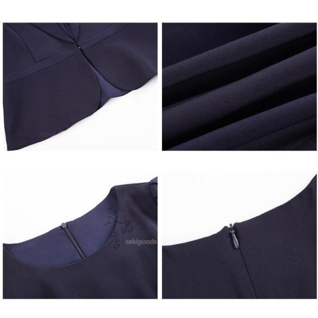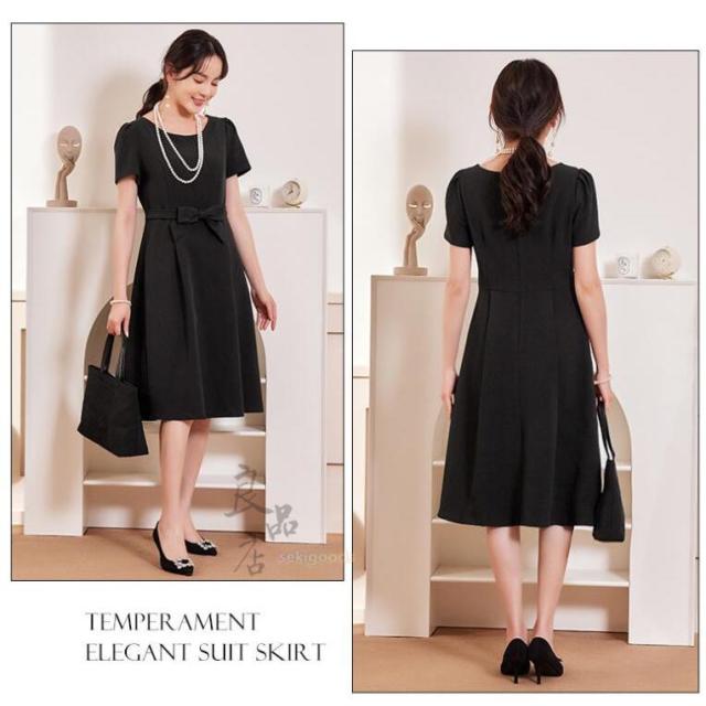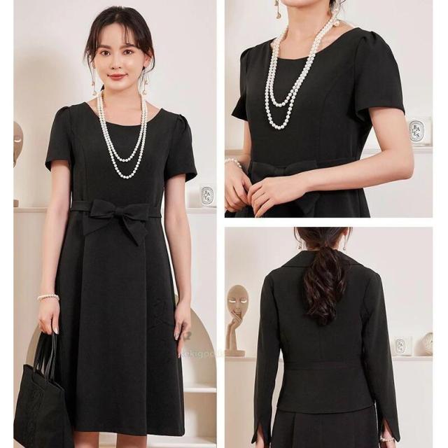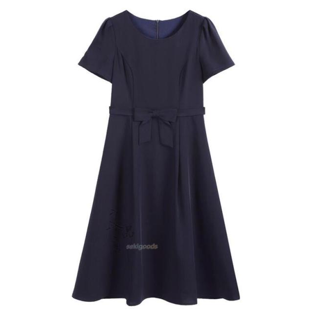 どちらも裏地付きで透け感や型崩れを気にせずかっちりと着こなせます。裾に向かってふんわり広がるAラインフレアと、ウエストマークのリボンが女性らしいデザイン。半袖なので単品使いでも腕周りを気にせず着用可能です。