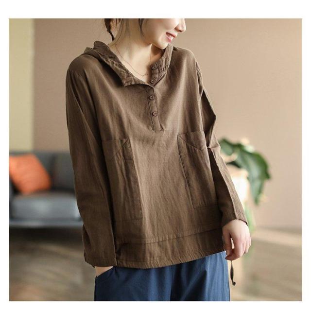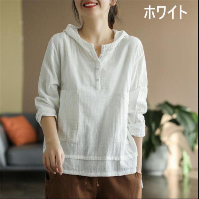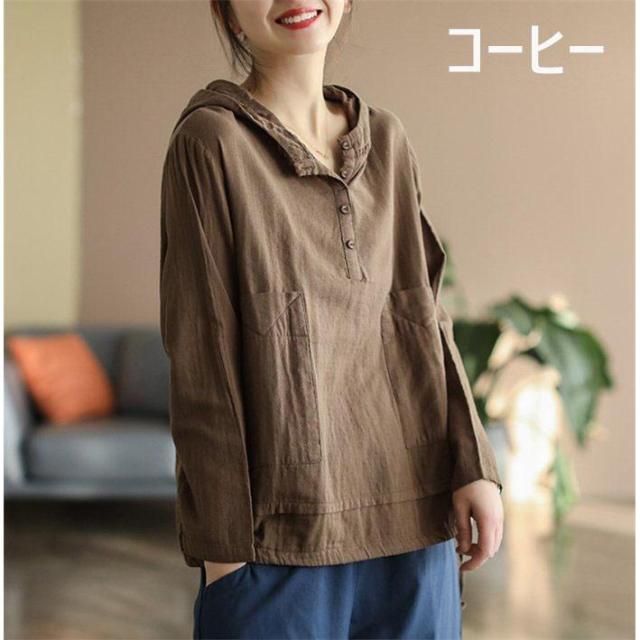 ブラウス パーカー Tシャツ レディース 長袖 シャツブラウス 春 夏 リネン フード付き ガーゼ 綿麻トップス 着心地 長袖 大人 ゆったり 体型カバー
