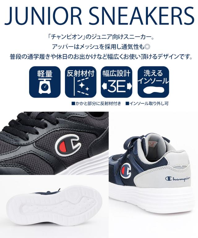チャンピオン スニーカー キッズ ローカット 子供靴 紐靴 男の子 女の子 ジュニア シューズ 反射材 メッシュ 軽量 小学生 中学生 男子 通学 学校 女子 幅広 3E 黒 ブラック ネイビー 白 ホワイト Champion J302