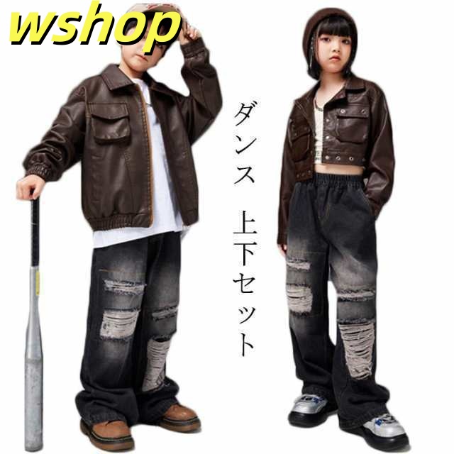 在庫限りの大特価 毎日使える便利品 SNS話題 【wshop 話題商品 】キッズダンス衣装 デニムパンツ 今だけ デニム ダメージ PU革 セットアップ ジーパン パンツ ジーンズ ブラウン レザージャケット ヒップホップ 送料無料実施中