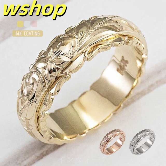 ハワイアンジュエリー リング 14K 刻印 プルメリア スクロール 彫刻 デザイン ハワイ 指輪 ペアリング エタニティ マリッジ エンゲージ プロポーズ 結婚 マリッジリング 装飾 細身 レディース メンズ 男女兼用 ユニセックス ハワイアン ジュエリー