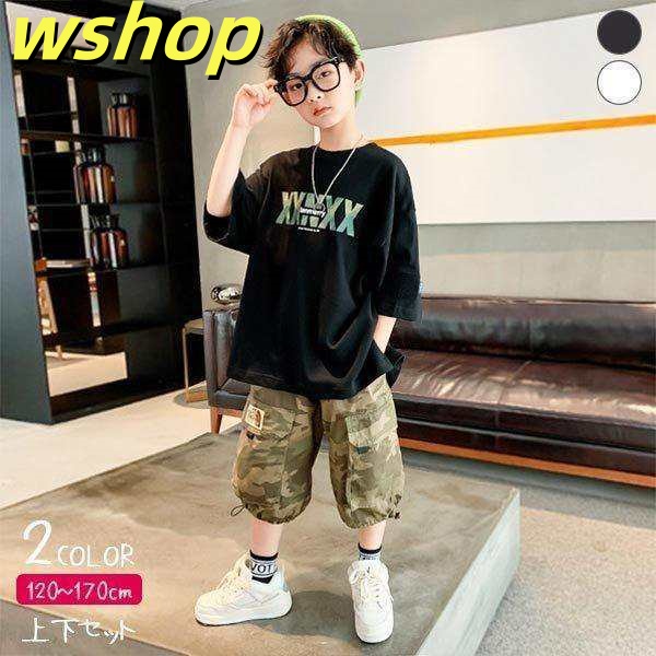 夏服 上下セット 子供服 セットアップ 男の子 おしゃれ 小学生 中学生 tシャツ 襟 前開き 半袖 半ズボン 迷彩柄パンツ カモフラージュ ホワイト ブラック 白 黒