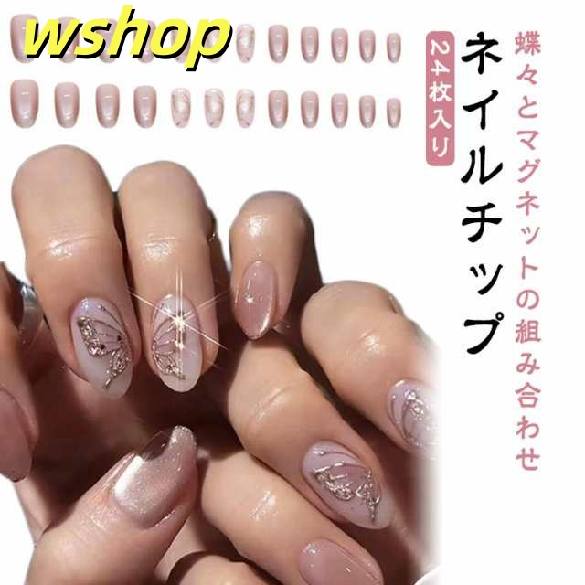 マグネット 可愛い ネイルチップ 貼るだけ 簡単 オーバル デザイン ネイル おしゃれ ピンク系 かわいい 高級感 結婚式 つけ爪 成人式 蝶々 ネイルチップ 発表会 人気 シンプル 手作り 24枚入