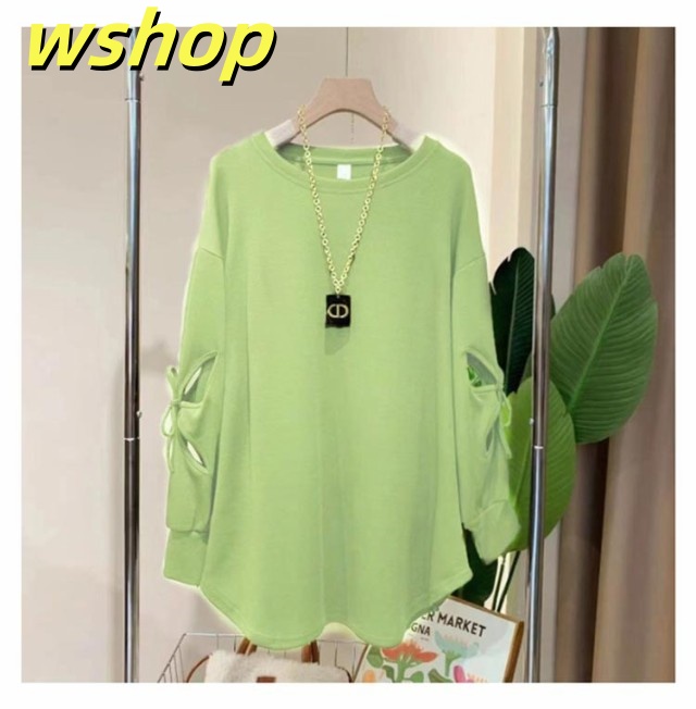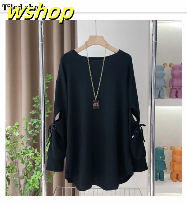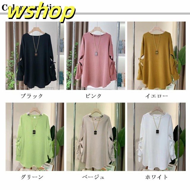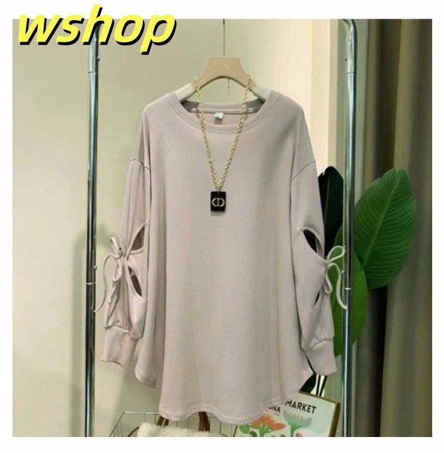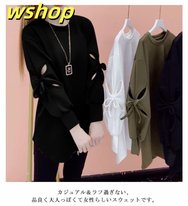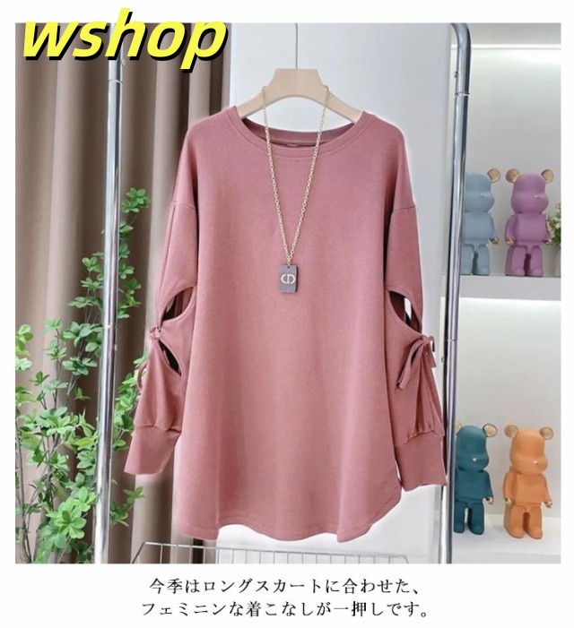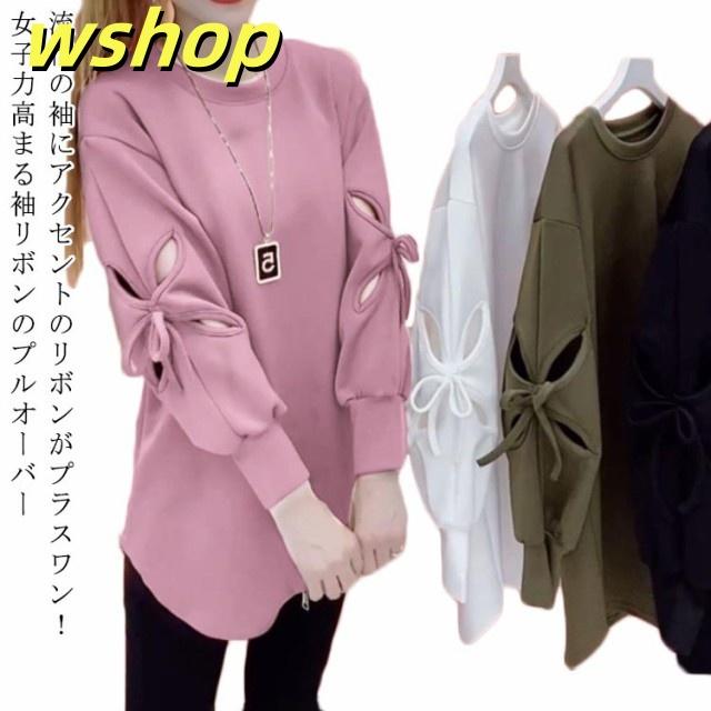 スウェット レディース プルオーバー 袖リボン 可愛い カットソー 秋 おしゃれ ロンT ラグラン トップス 春服 トレーナー ぽわん袖 ボリューム袖 長袖 トレーナー トップス 体型カバー ラウンドヘム ロンティー マタニティ 大きいサイズ 無地