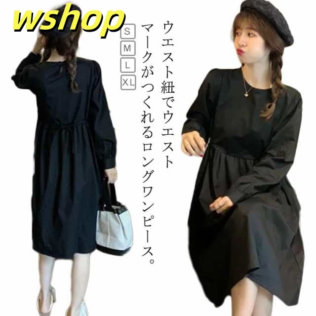 【wshop 】ワンピース 大きいサイズ ロングワンピース 秋 レディース ワンピース 体型カバー テントワンピース Aラインロング マキシ 体型カバー 無地 長袖 ウエストマーク 黒 ロングワンピ オフィス 冬 パーティードレス ワンピース ワンピ マタニティ 30代 40代 50代
