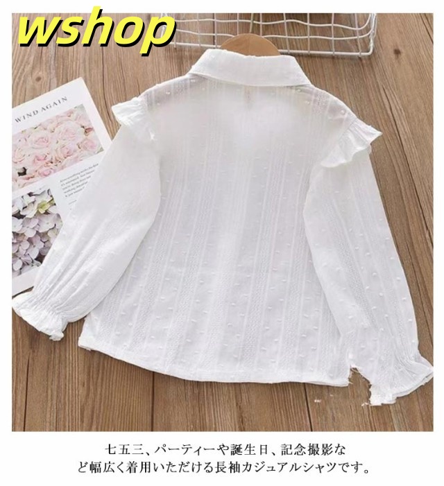| 入学式・卒業式 フォーマル長袖白ブラウス かわいいプリンセスの印象を与えますから、通学通園はもちろん、 結婚式、入園や入学・卒園や卒業などのイベントにもお使いいただけます。 流行りすたりのない上品で清楚なデザインです。 普段にもお出かけにもぴったり! 七五三、パーティーや誕生日、記念撮影など幅広く着用いただける長袖カジュアルシャツです。 | |