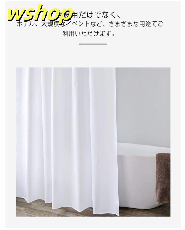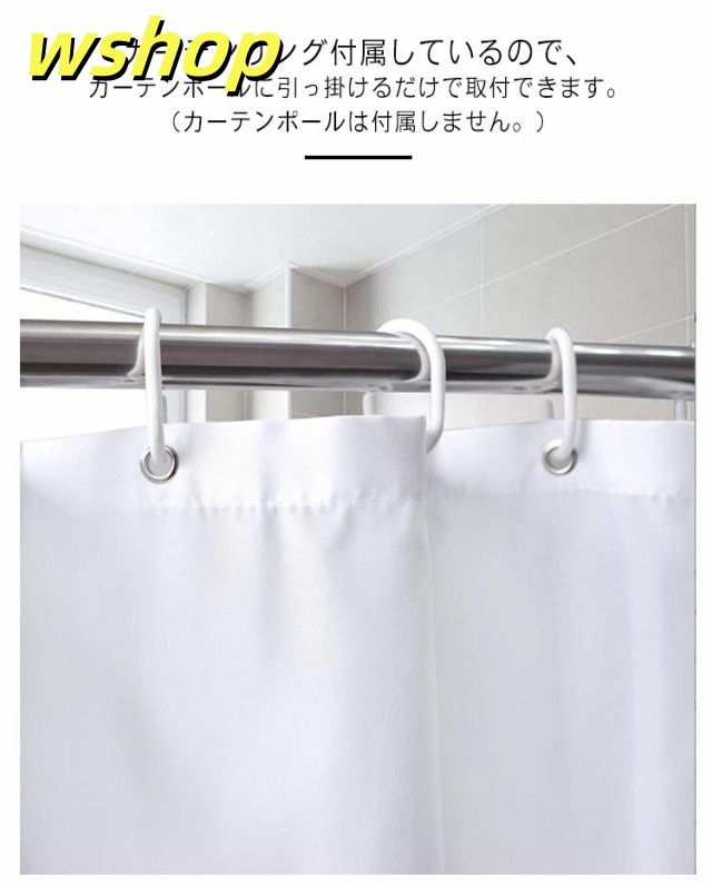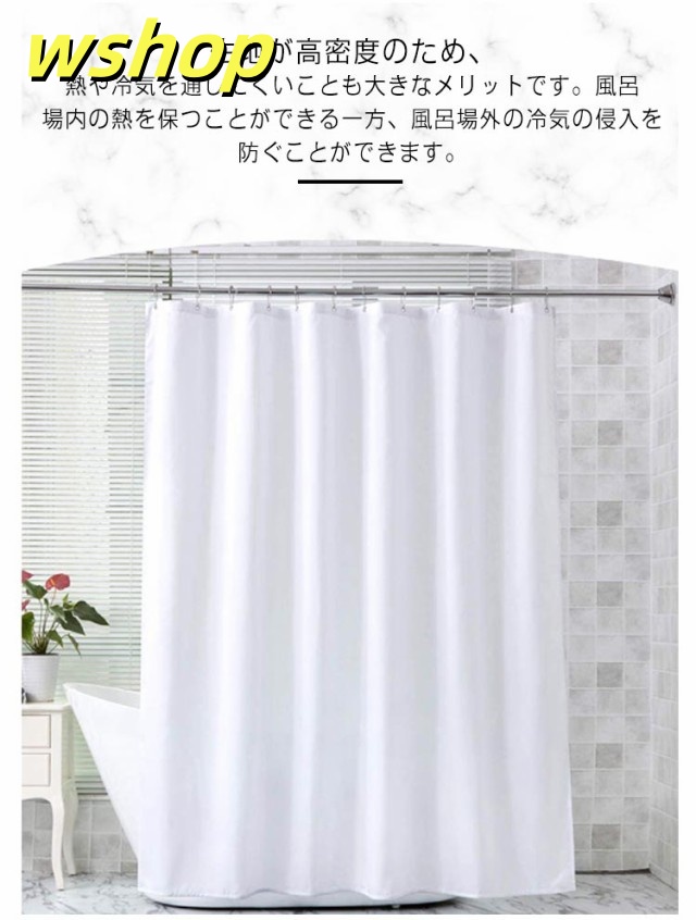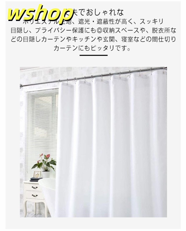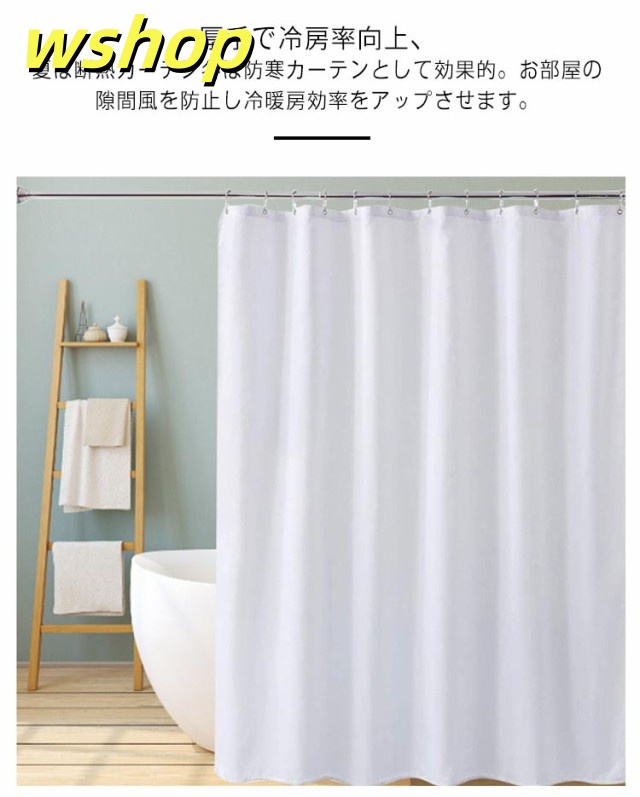 | 傷みにくいポリエステル生地のシャワーカーテン。 防水・防カビ加工済み 生地が高密度のため、熱や冷気を通しにくいことも大きなメリットです。風呂場内の熱を保つことができる一方、風呂場外の冷気の侵入を防ぐことができます。 厚手で冷房率向上、夏は断熱カーテン冬は防寒カーテンとして効果的。お部屋の隙間風を防止し冷暖房効率をアップさせます。 丈夫でおしゃれなポリエステル生地、遮光・遮蔽性が高く、スッキリ目隠し、プライバシー保護にも◎収納スベースや、脱衣所などの目隠しカーテンやキッチンや玄関、寝室などの間仕切りカーテンにもピッタリです。 家庭用だけでなく、ホテル、大規模なイベントなど、さまざまな用途でご利用いただけます。 カーテンリング付属しているので、カーテンポールに引っ掛けるだけで取付できます。(カーテンポールは付属しません。) | |