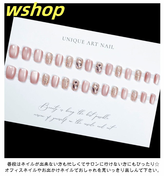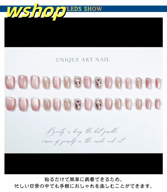 | 【キラキラ・ネイルチップ】【30枚入り】 エレガントなデザインのつけ爪です。 ピンク系の色合いが施された爪は、ラインストーンで飾られており、キラキラとした輝きが特徴です。 貼るだけで簡単に装着できるため、忙しい日常の中でも手軽におしゃれを楽しむことができます。 立体感のあるデザインは、指先を華やかに彩り、華やかで可愛い! ネイルチップなら貼るだけですぐに本格ネイルの出来上がり! 普段はネイルが出来ない方も忙しくてサロンに行けない方にもぴったり☆ オフィスネイルやお出かけネイルでおしゃれを思いっきり楽しんで下さい。 使用説明: 【接着剤タイプの場合】 爪を磨く アルコールパッドなどで拭く ネイルチップにグルーを少しずつ塗る。 グルーをキレイに塗れたら、爪先に貼りつける。 外し方: 1.ぬるま湯に5?10分間浸す。 2.ネイルチップをゆっくりと剥がす。 3.爪の接着剤をキレイに落とす。 【粘着グミタイプの場合】 爪を磨く アルコールパッドなどで拭く 適切な粘着グミを選ぶ 粘着グミを爪に押す 必ず気泡を排除してください ネイルチップを押しながら爪に押し込む 20秒ほど押さえてフィットさせる | |