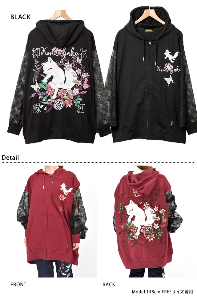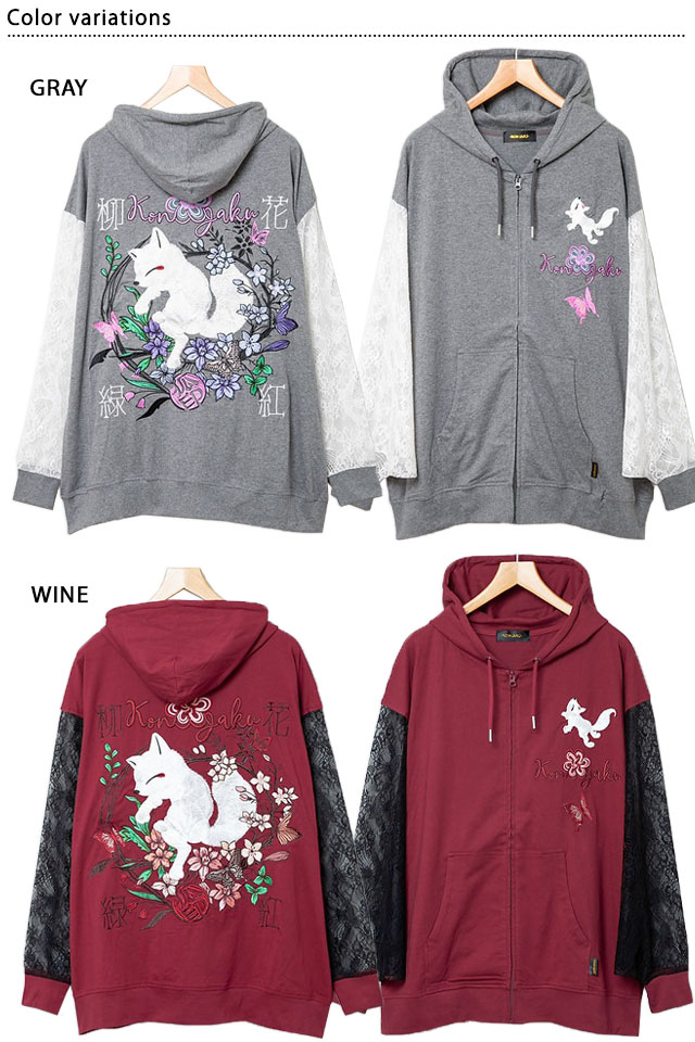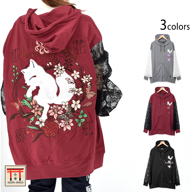 愛らしい狐のキャラクターが主役の【今昔】から「花紅柳緑総刺繍ジップパーカー(KJ-29227)」のご紹介です。 今昔から、袖部分がレースになった女性らしい華やかな装いが魅力的なスウェットパーカーが登場しました。 花紅柳緑(かこうりゅうりょく)は、色とりどりの華やかな装いという意味を持っています。 お尻が隠れる長めの丈や、ふんわりとドレープがかかったレースの袖など、体のラインをカバーしてくれる変形シルエットが魅力的。 普段の着こなしに気軽に取り入れることの出来る、和カジュアルなアイテムです。 | ||||||||||