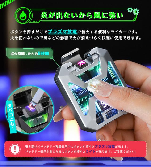●デジタル表示&ライト付き 電子ライター●【炎が出ないから風に強い】ボタンを押すだけでプラズマ放電で着火する便利なライターです。火を使わないので風などの影響で火が消えづらく快適に使用できます。点火時間は最大8秒間で、タバコやお香、キャンドルなどにもご使用いただけます。※蓋を開けてバッテリー残量表示中にボタンを押すとプラズマ放電が出ます。※バッテリー表示が消えた後にボタンを押すとライトが光ります。ご注意ください。