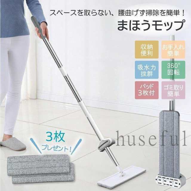 モップ フローリングモップ 360°回転 水切り替糸 タイル床フロア 自立式モップ 乾拭き マイクロファイバー パッド3枚付き まほうモップ 掃除