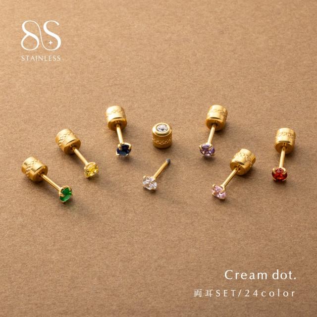 誕生月カラーのネジロック式のスタッドピアス。12か月のカラーと、ゴールド、シルバーから選べる全24展開。円柱型キャッチにもクリアカラーのビジューを施して前後どちらから見ても可愛い仕上がりに◎必ず使えるベーシックなデザインだから、ちょっとした贈り物にもオススメです。