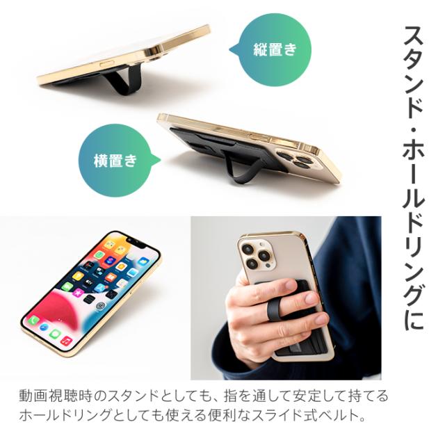 指を通してホールドリングとして使えるスライド式ベルトが、