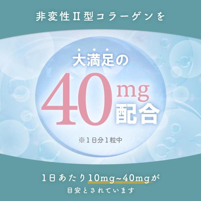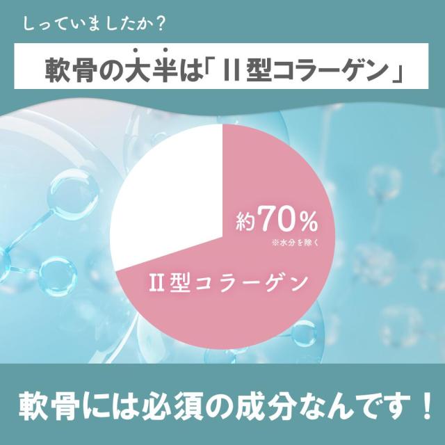| 原材料 | 鶏軟骨抽出物(非変性II型コラーゲン含有)、結晶セルロース、被包材[ゼラチン(豚由来)、二酸化チタン] ※商品は原料由来の為、製造時期により色合いが多少異なる場合がございます。 |