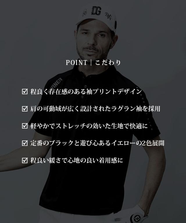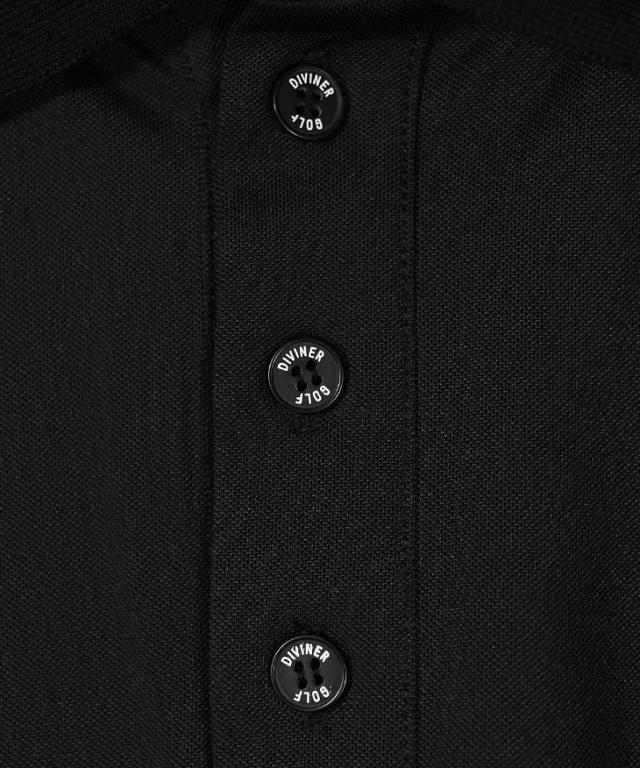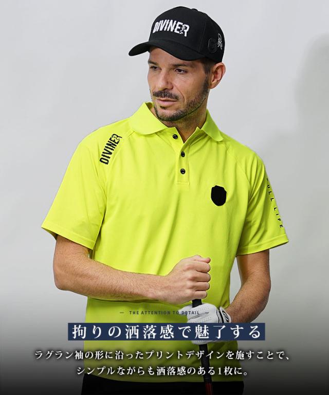 DIVINER GOLF(ディバイナーゴルフ)『袖プリントラグランポロ』【袖プリントラグランポロ】■Design/デザインアクティブなシーンで目を引く。スタイルと機能性を兼ね備えた一着。袖プリントラグランポロシャツは、DIVINER GOLFの洗練されたデザインが光る一着で、ラグラン仕様が動きやすさを追求し、どんな動きにも完璧にフィット。左右の肩に施されたロゴと、左胸のゴム製ロゴパッチが、シンプルながらも印象的で、ひと目でその違いがわかるデザインに。スポーティな印象を与えつつ、細部にまでこだわりが感じられます。伸縮性のある素材が、動きにしっかり追従し、快適な着心地を提供。カラーは、シックなブラックと、目を引く蛍光イエローの2色展開。