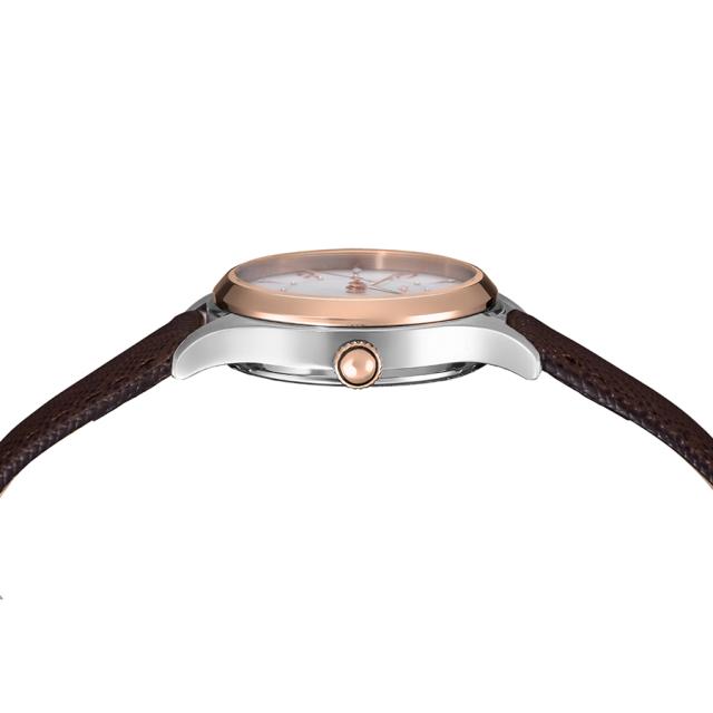 スタッズやクリスタルを採用した大小さまざまなインデックスによってシンプルかつ程よいおしゃれ感を演出します。また、高級感のある手元を演出するサフィアーノレザーを採用し、汚れや傷にも強く安心してご着用いただけるのもうれしいポイントです。