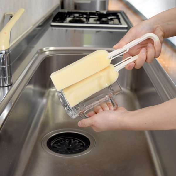 2つに割れたスポンジでコップをはさみ、回しながら洗えば、コップの内側と外側を同時に洗うことができます。
