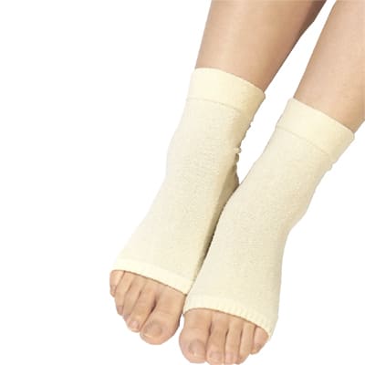 天然繊維の絹でできた足裏を全面保湿できる、つま先フリーソックス。ズレないうるおいシートはかかとと裏面に潤いを与える高分子ビニールシート。1枚1枚シート職人が丁寧に縫い付ける、手間を惜しまないこだわりを持って仕上げています。天然繊維のシルクは吸湿性、放湿性に優れ、夏は涼しく冬は暖かい素材。季節を問わず年中快適に使えます。靴下の生産日本一の奈良県で一足一足丁寧に真心をこめて編み立てた一品です。