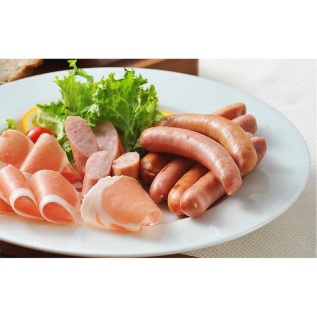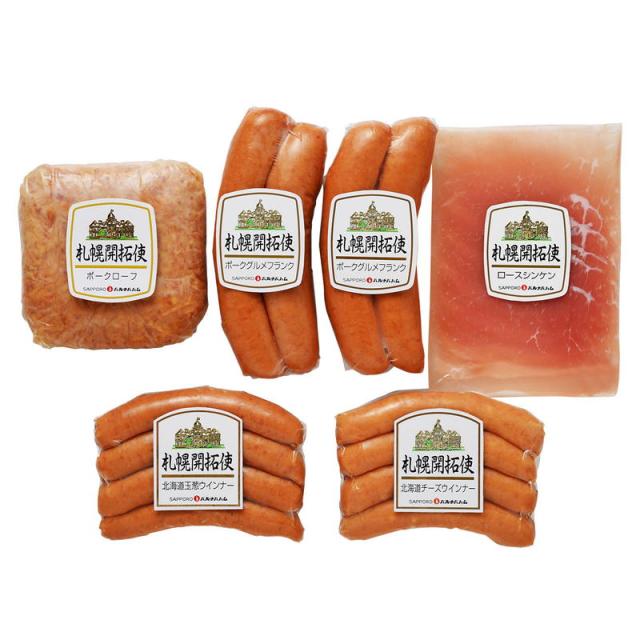 内容:ポークローフ170g、北海道玉葱ウインナー100g、北海道チーズウインナー100g、ポークグルメフランク120g×2p、ロースシンケン40g